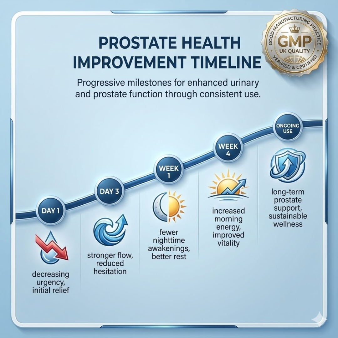 Many men report feeling the first improvements within the first few days — especially with nighttime urination, urgency, and pressure.